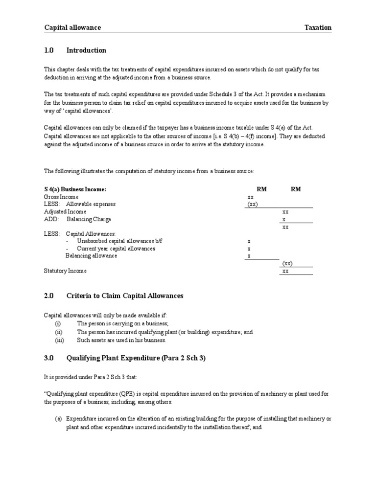 The definition of an asset can alter from business to business. An amount of money that a business spends to buy buildings, equipment, vehicles, etc., which it can…. Capital allowances can be claimed to give you tax relief on the cost of capital expenditure incurred to do your job or run your business. Capital allowances are an amount of money spent on assets that can be subtracted from what is officially owed in taxes. Capital allowances may be claimed on most assets purchased for use in the business, ranging from equipment and research costs to expenses for building renovations.